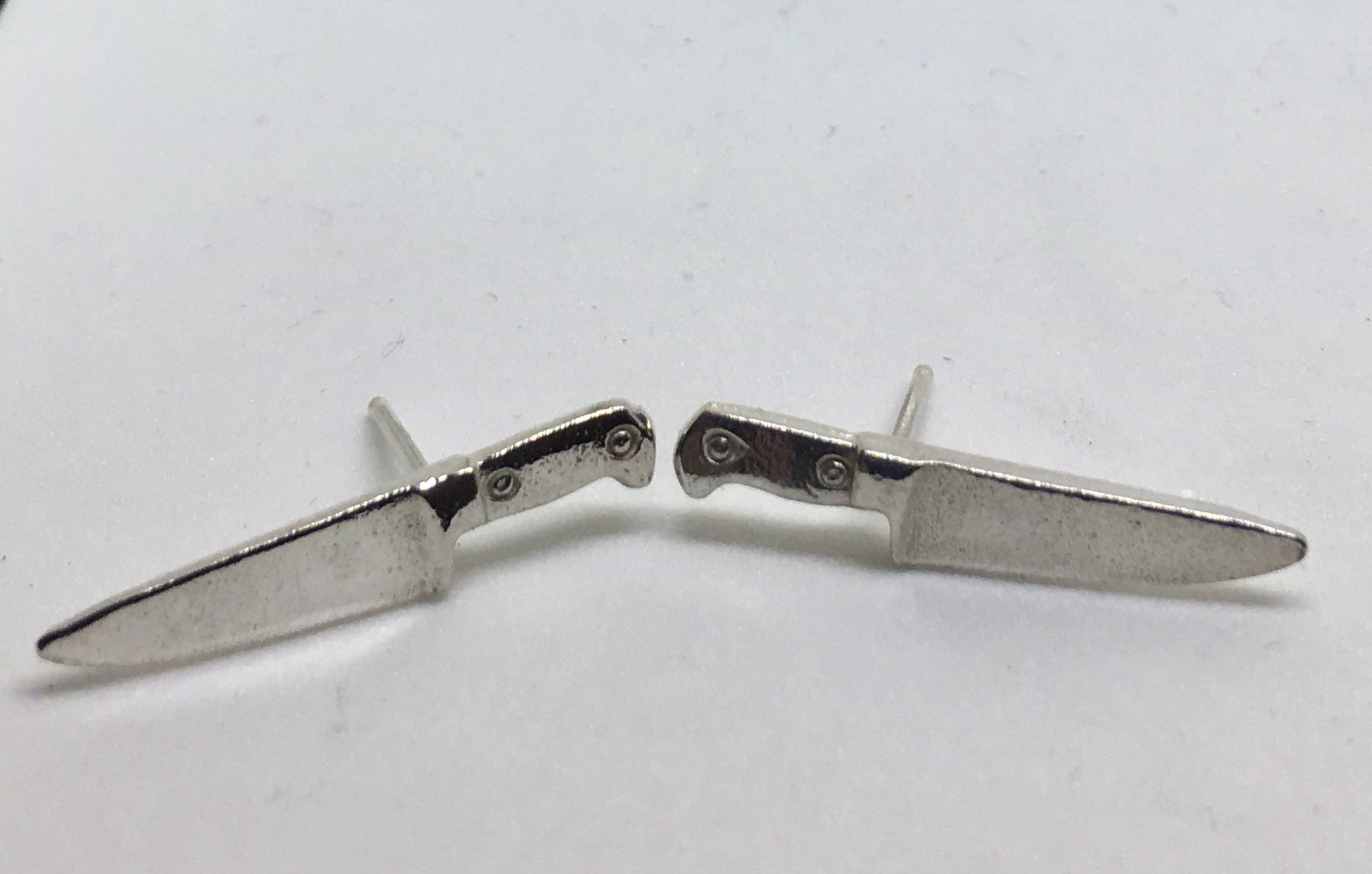 These chef knife post earrings are solid sterling silver and have notched posts with friction ear nuts.