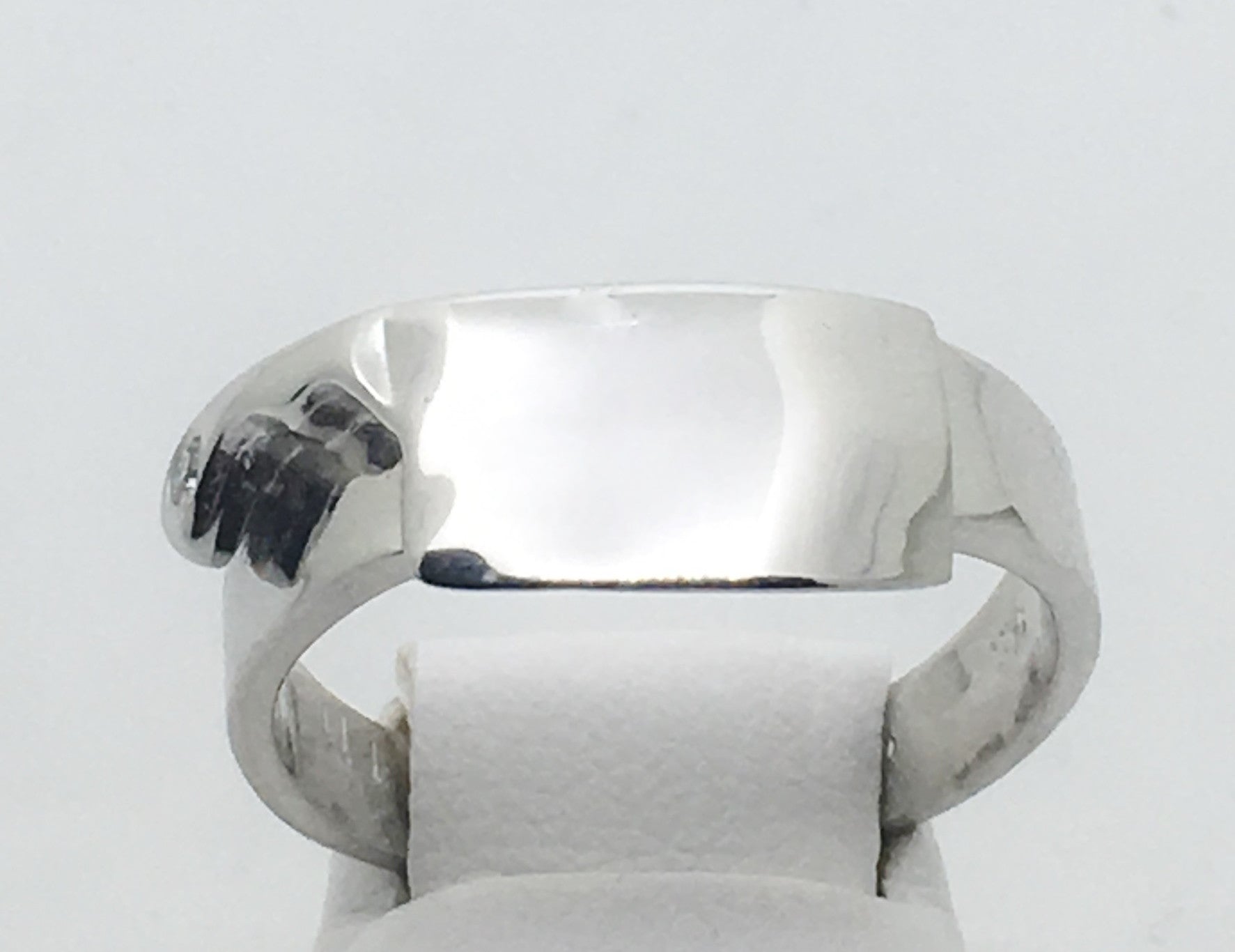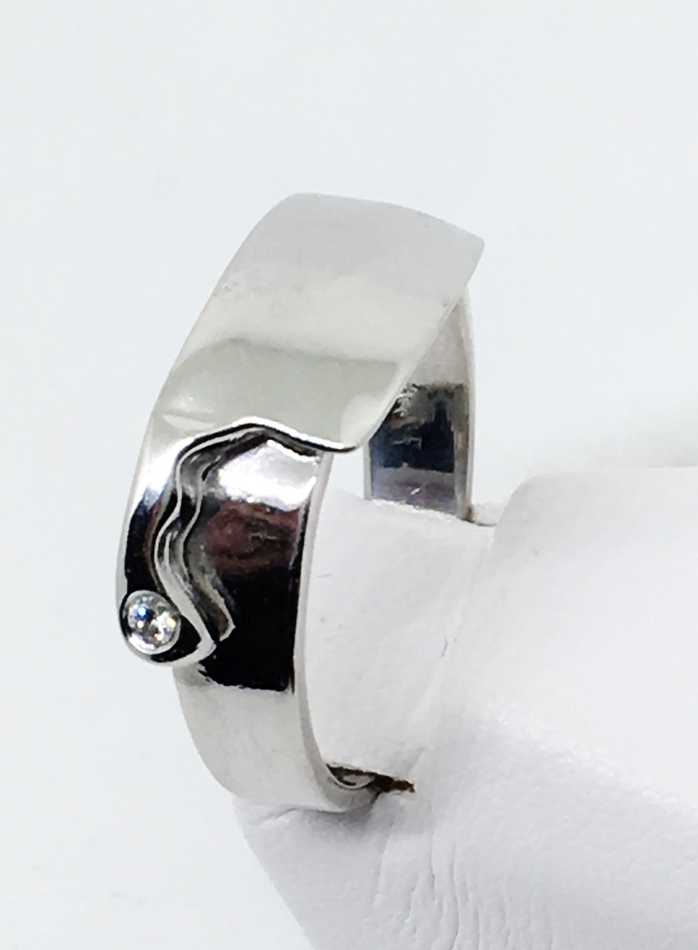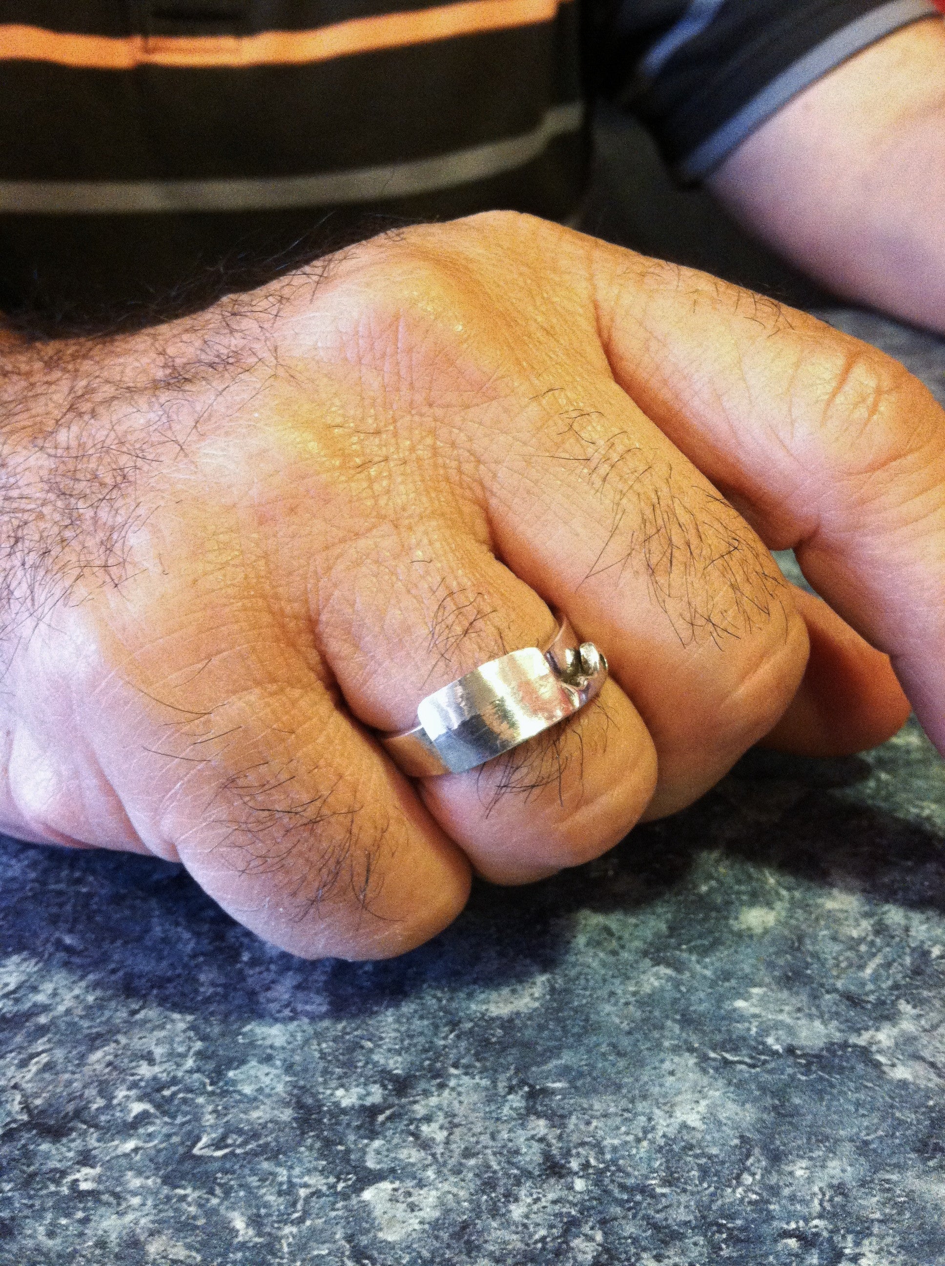 This chef's cleaver ring is solid sterling silver and it is set with one VS2/SI1, H/I round brilliant diamond, about .015ct. A bit of sparkle.