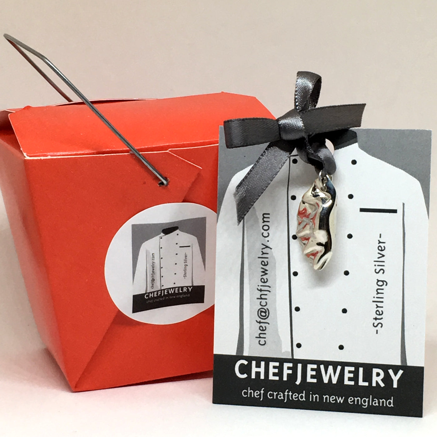 Your charm will arrive in a custom made CHEFJEWELRY card and chef's pinstripe gift box, all tied up with ribbon, or you can choose the cute red take out box.