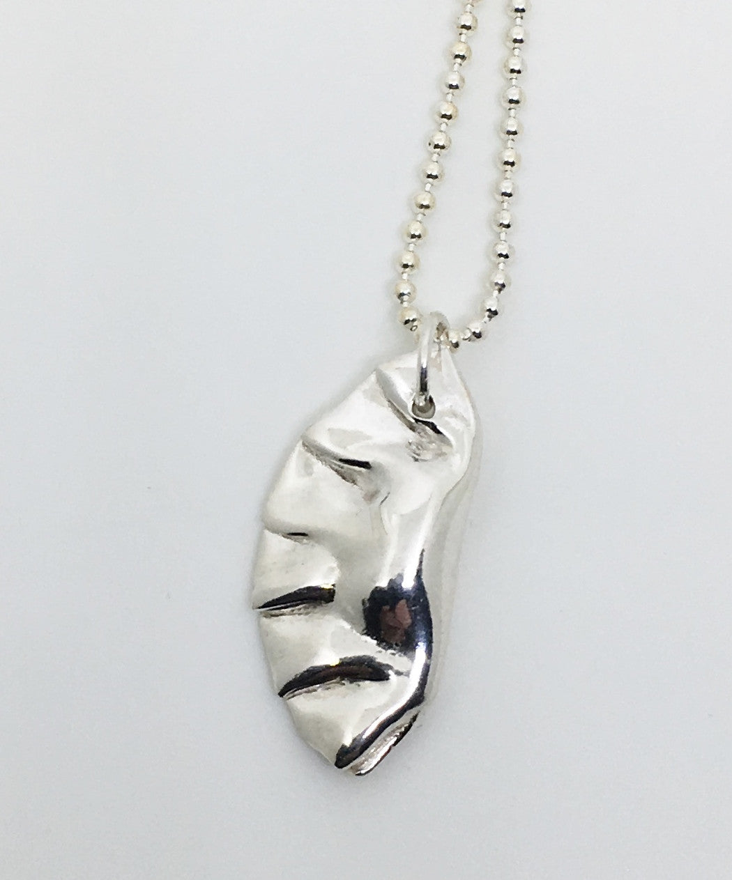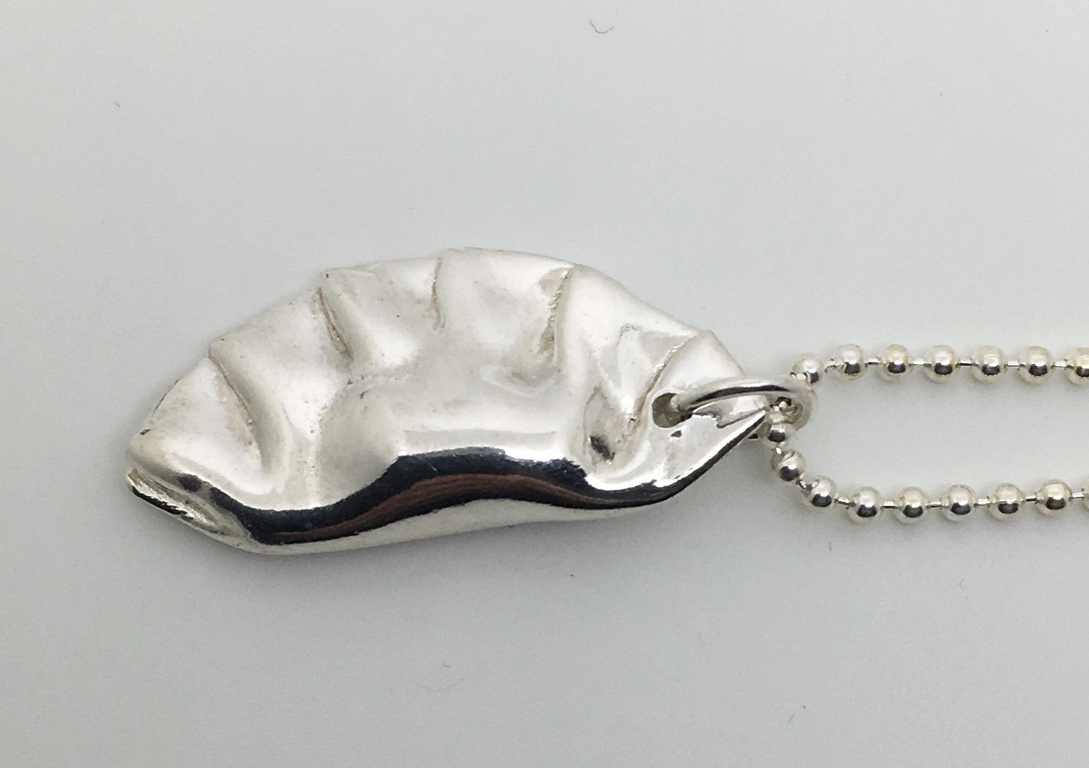 This potsticker dumpling charm necklace is solid sterling silver and hung on a solid sterling silver bead chain. You can choose your chain length at checkout.