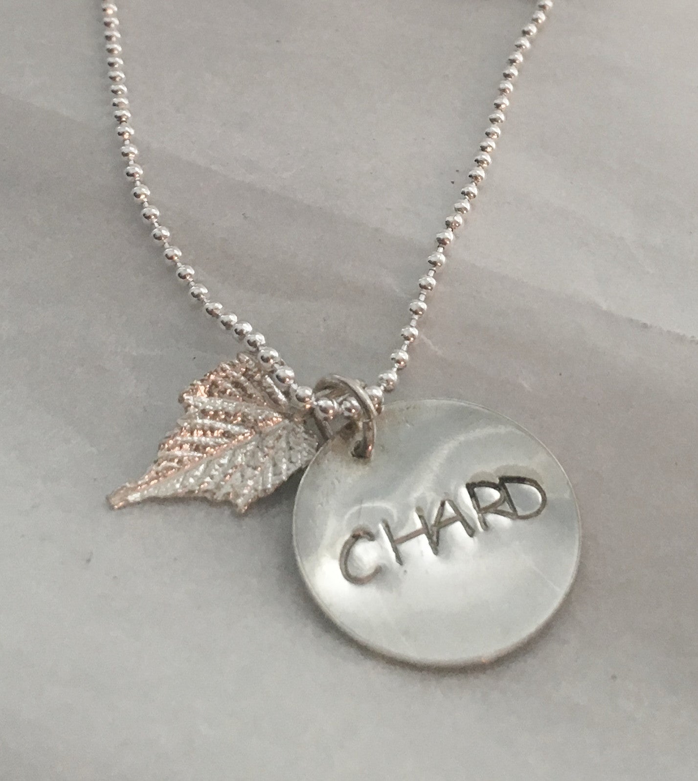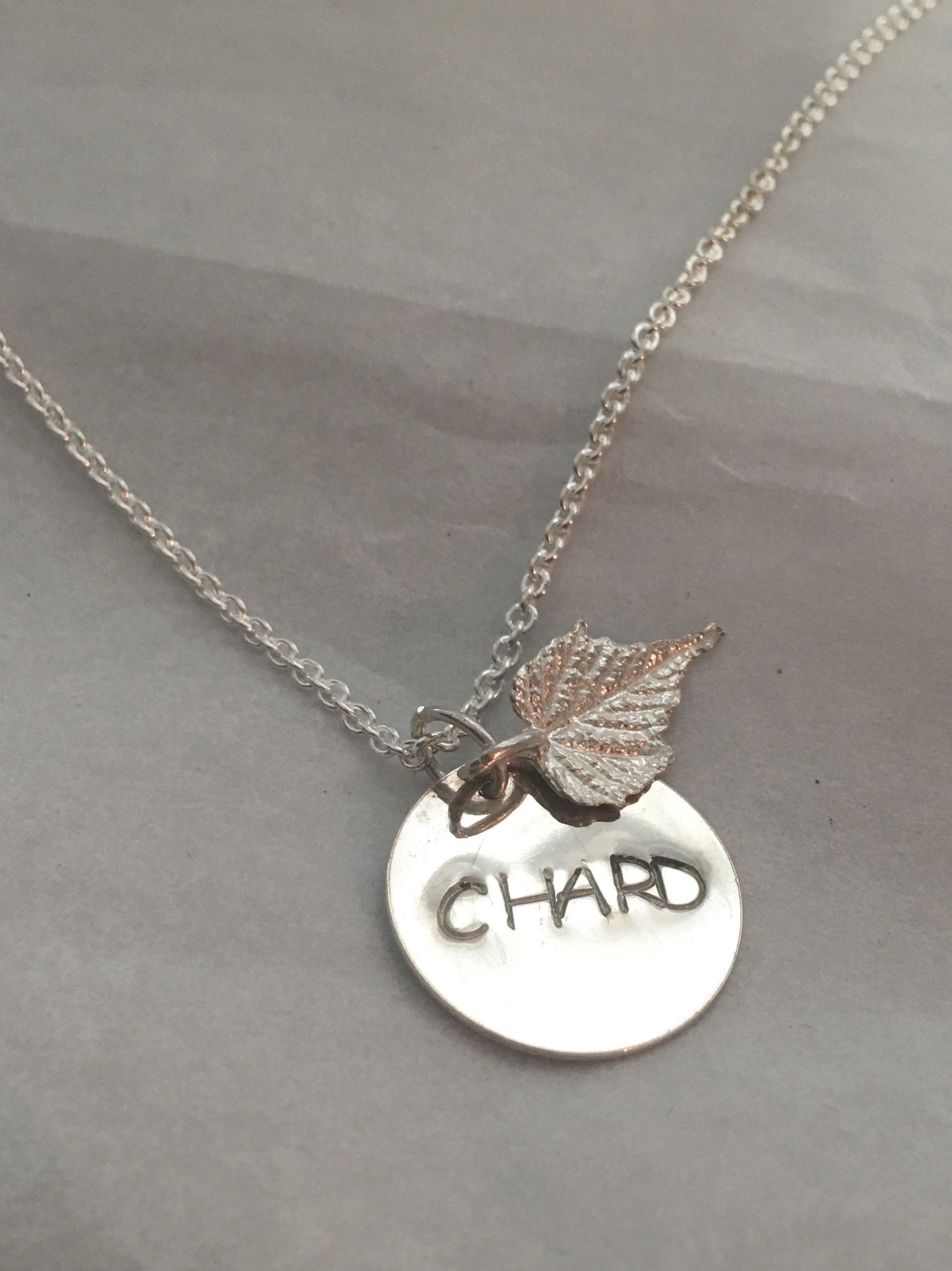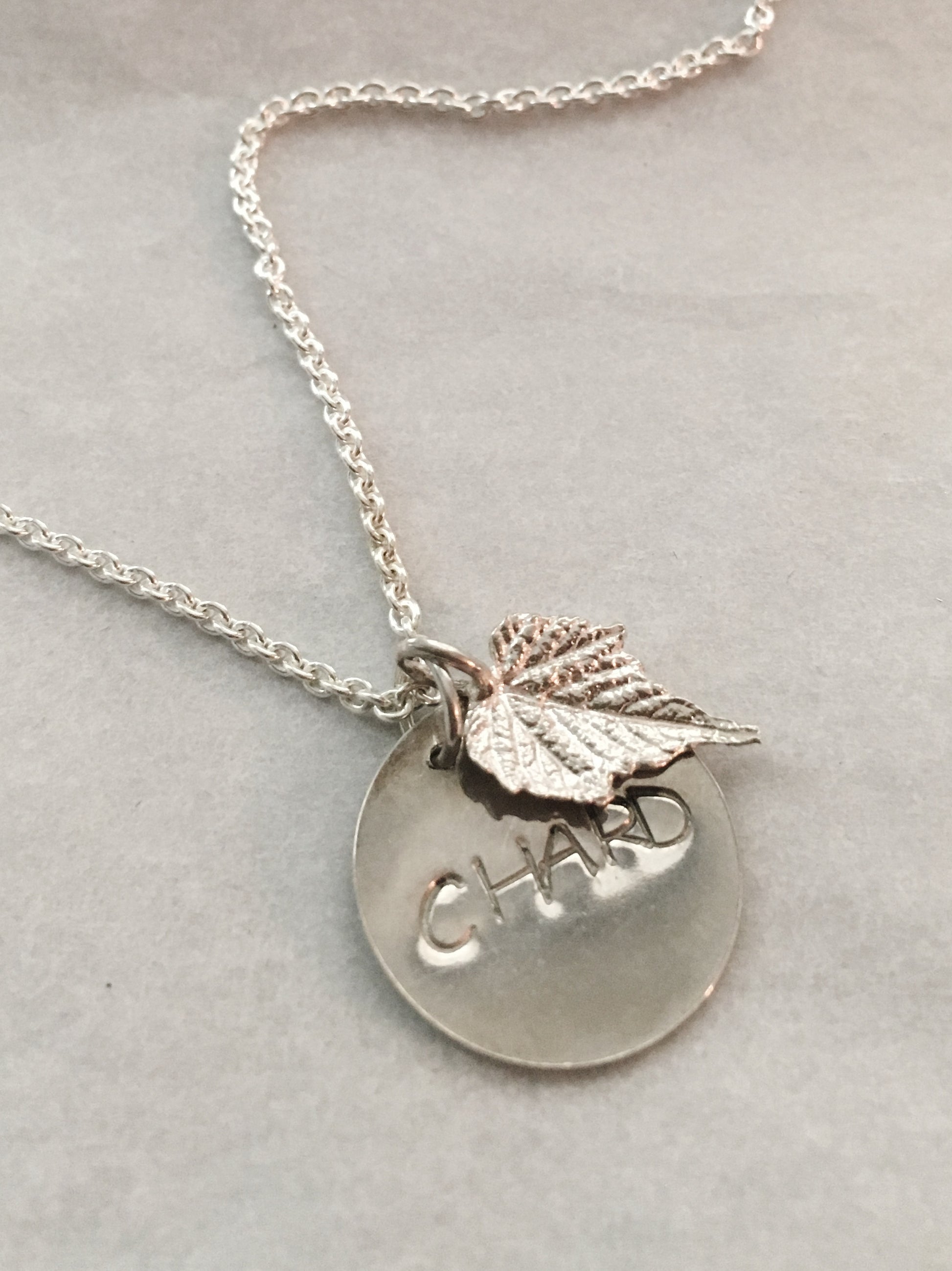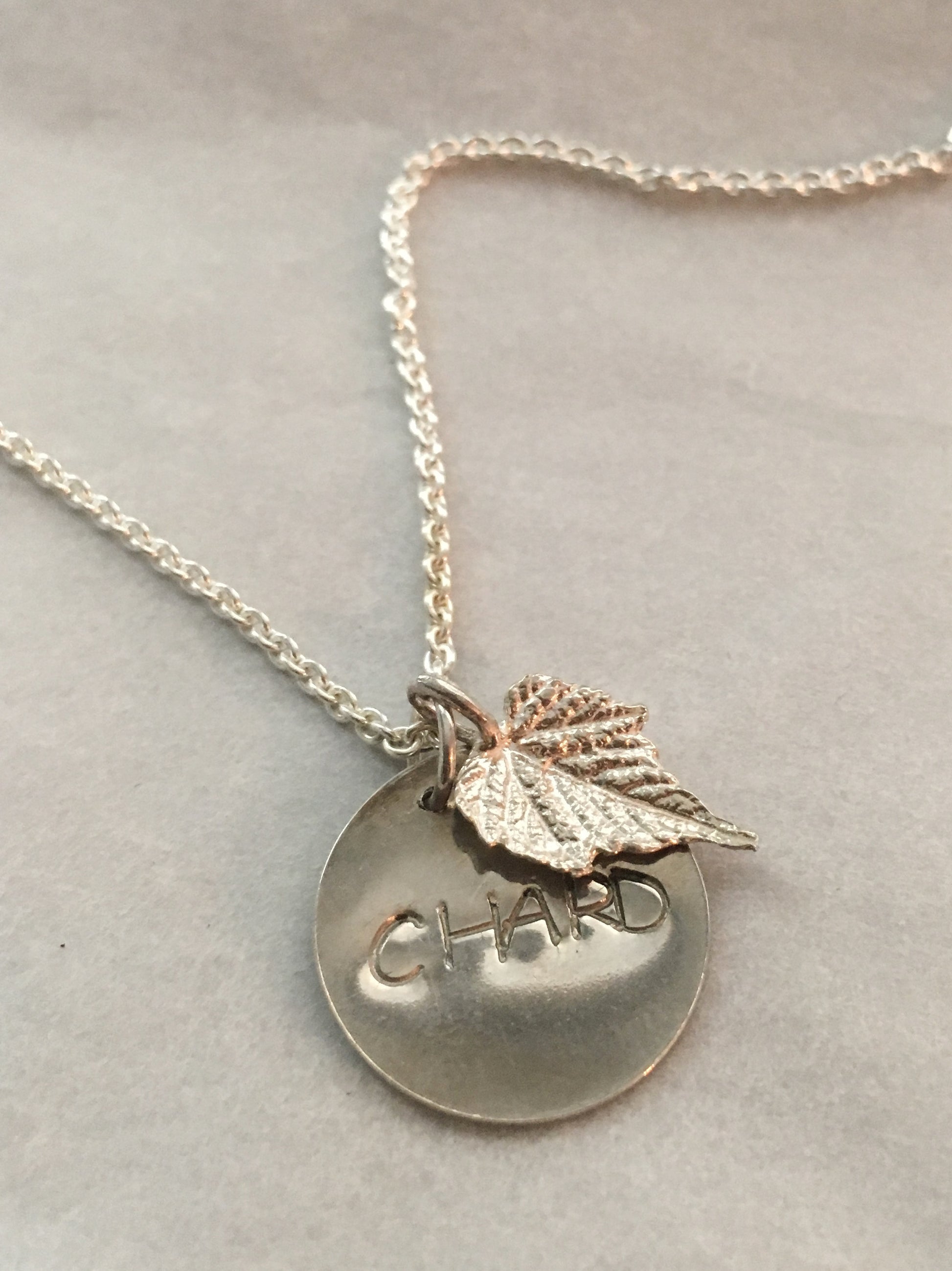 The grape leaf and charm are solid sterling silver (.925). The grape leaf began as a real leaf and was then cast in silver with a special process.