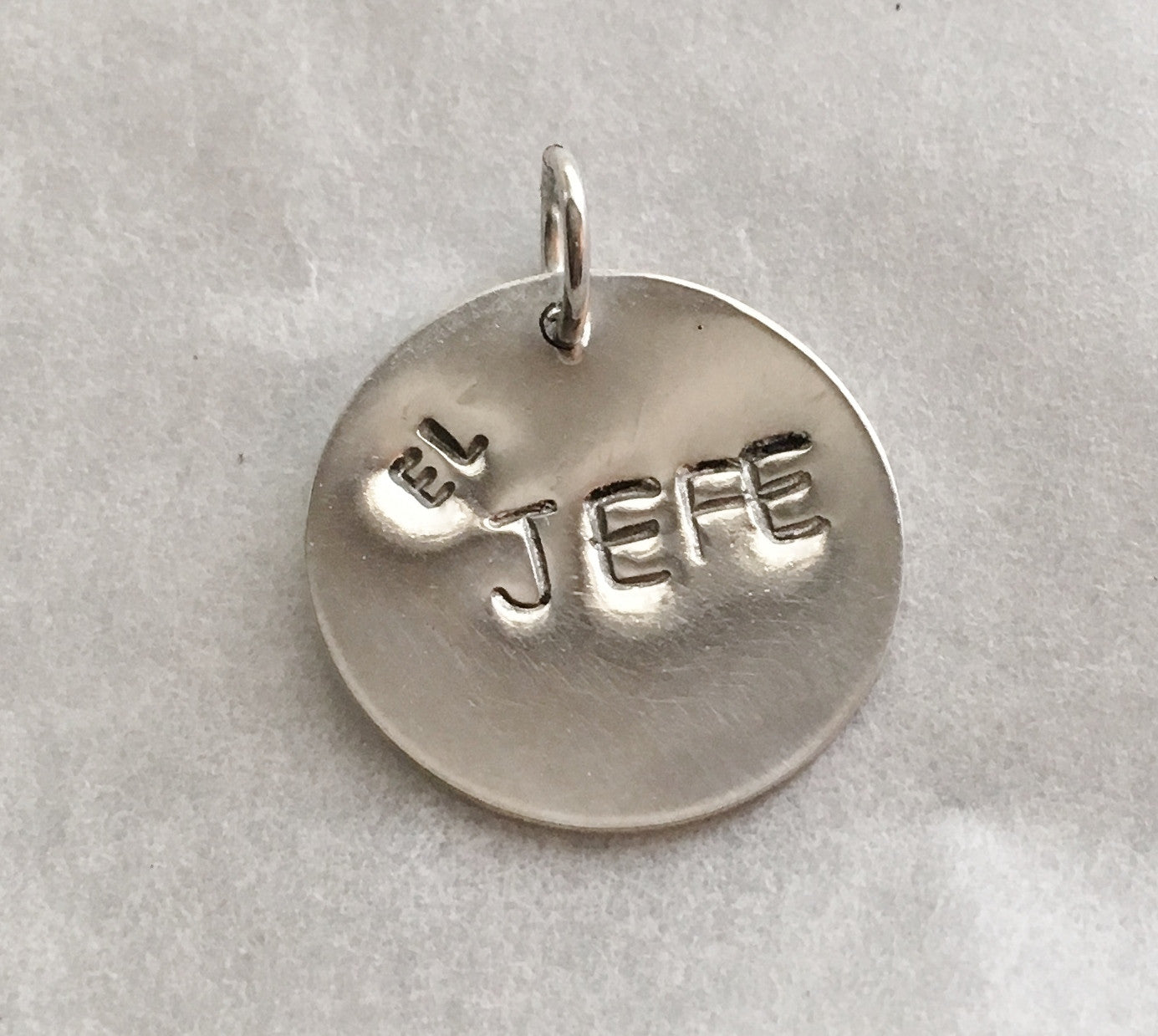 This hand stamped El Jefe pendant charm is solid sterling silver.